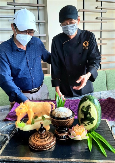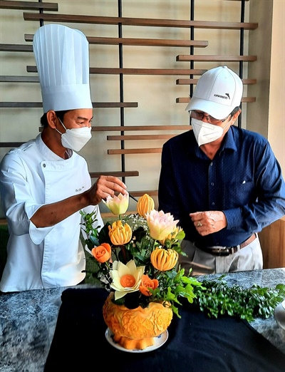 Nhà nghiên cứu Lê Tân và Nghệ nhân văn hoá ẩm thực Vinpearl Bùi Phúc Nghĩa thẩm định chế tác nghệ thuật cắt tỉa và bài trí củ quả trong sự kiện "Tinh hoa Ẩm thực Việt"