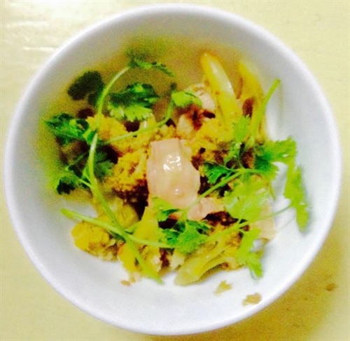 - Cho tất cả (cho su vào nấm và phù chúc đã ướp) vào bát canh; cơm vừa cạn nước đặt bát vào để hấp đến khi chín cơm, lấy bát su lơ ra rắc ít tiêu, rãi ngò lên mặt.