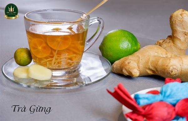- Cho gừng tươi thái sợi nhuyễn, tắc cắt đôi cho vào tách trà đã pha.