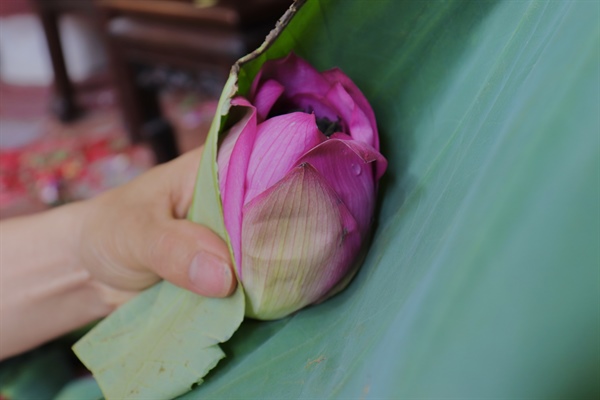 Bông sen sau khi bọc chè sẽ được lá sen bọc chặt bên ngoài và cắm một đêm để hương sen thấm đều vào chè