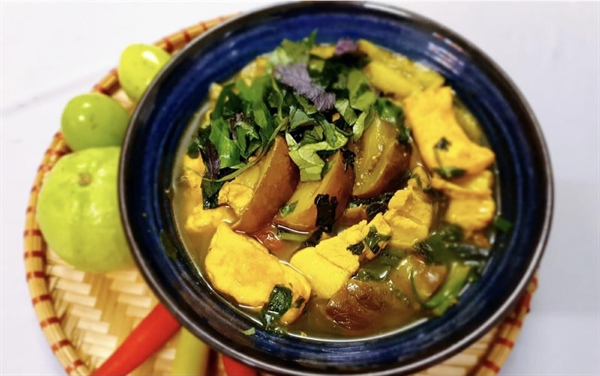 Món cà tím vàng óng sóng sánh, miếng cà mềm mượt bở tơi trong miệng, cà ngấm đủ gia vị, chua chua của mẻ, ngọt đậm đà thịt, thơm nồng mùi tía tô. Miếng đậu thơm mùi nghệ, lại mềm mềm beo béo, thấm đẫm nước dùng sền sệt, miếng thịt dai dai ngậy ngậy thơm thơm, cà chua chín nhuyễn hòa cùng với nước mẻ tạo nên vị chua thanh thanh, ngọt dịu dịu. cắn thêm trái ớt tươi , thật hấp dẫn.