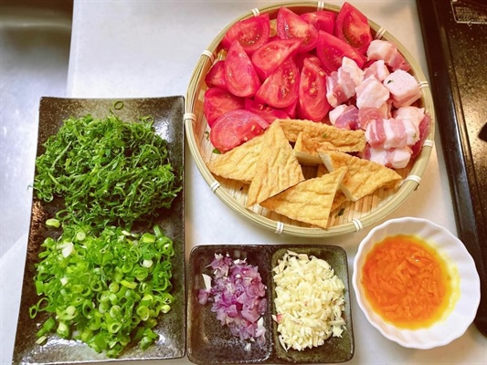 -Đậu : 3 bìa đậu nướng rửa sạch, có thể thay bằng đậu mơ thái miếng dày 1 đốt ngón tay rán vàng.