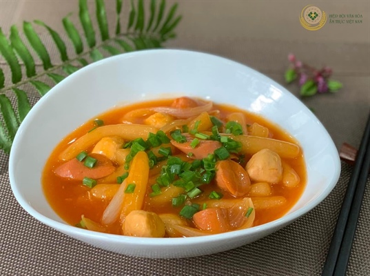 Bắc chảo lên bếp, cho 1 thìa canh dầu ăn đến khi nóng thì cho 1 thìa canh tỏi vào phi thơm. Cho phần nước dùng vừa pha sẵn vào đun sôi, cho tiếp bánh tokbokki, hành tây, xúc xích, chả cá vào… rồi nêm nếm sao cho vừa ăn. Đun sôi khoảng 5 phút cho gia vị ngấm đều vào bánh.