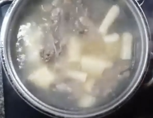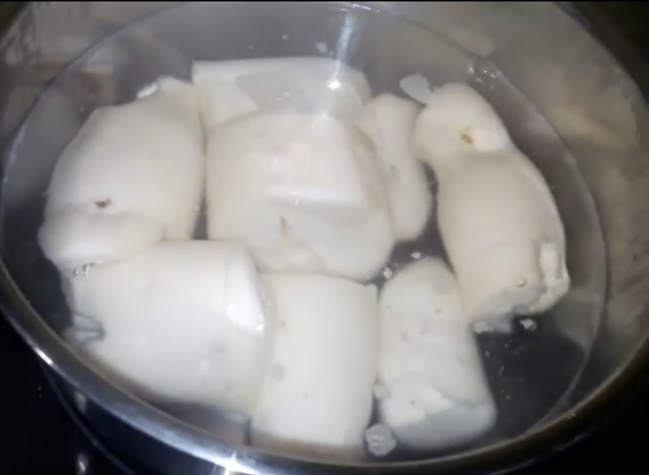 Để nấu món canh sắn, mẹ chọn những củ sắn múp, ít xơ, không quá to. Mẹ lột hết vỏ sắn và rửa lại sạch sẽ rồi lấy dao nạo từng miếng bằng đốt ngón tay rồi ngâm trong nước khoảng một giờ cho hết nhựa, sau đó vớt ra rổ để ráo nước. Mẹ cho dầu phụng vào nồi, phi hành lên cho thơm, rồi cho xương đã làm sạch và ướp gia vị vào tao cho thấm đều, rồi xào cho ngấm mắm muối, khi xương tiết ra nước ngọt, tiếp đó đổ nước và sắn vào nấu khoảng độ ba mươi phút. Khi canh chín, chuẩn bị nhắc xuống thì cho muối, bột ngọt, rau thìa là và một ít bột tiêu vào là có được món canh sắn thơm ngon, đậm đà. Nồi canh sắn đạt yêu cầu là phải không quá nát, không quá đặc, không quá loãng, lúc ăn có vị bùi và béo của sắn, vị ngọt của xương, mùi thơm hấp dẫn của hành, của rau thơm và gia vị. Trước khi ăn, tra thêm chút mắm muối nữa, đun sôi lại rồi rắc hành thìa là, nhắc canh ra ngay.