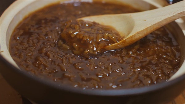 - Khi thấy gạo nếp đã hơi nở, cho tiếp phần đường mật/ đường mía vào, nêm nếm cho vừa khẩu vị nhưng không quá ngọt.