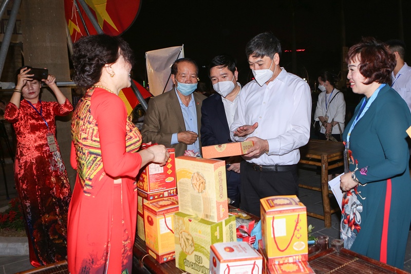 Phó Chủ tịch UBND tỉnh Nam Định Trần Lê Đoài và các đại biểu tham quan khu vực giới thiệu đặc sản ẩm thực các vùng miền