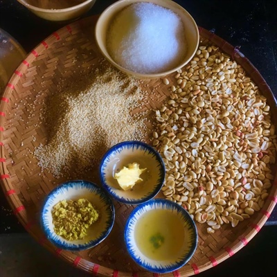 - Lấy chổi quết một lớp mỏng dầu ăn lên mâm rồi lấy giấy ăn lau gần hết, chỉ để lại một lớp thật mỏng. Rắc một nửa vừng rang chín lên mâm, để qua một bên.