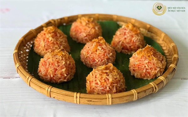- Lấy 1 viên đậu xanh bao kín miếng thịt vo tròn, dùng bột gấc khoai lang bao viên bên ngoài rồi lăn trên gạo nếp sao cho gạo bao kín trên bánh.