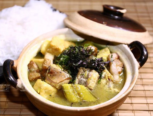 Nói về cách chế biến thì đầu tiên cá lăng được mua về phải làm sạch, loại bỏ mùi tanh rồi sắt miếng. Sau đó ướp cùng hỗn hợp với nước riềng, mẻ và mắm tôm. Đậu phụ được cắt ra và rán giòn. Thịt ba chỉ thì đảo cháy cạnh và cuối cùng chuối xanh bóc vỏ ngâm nước muối loãng.