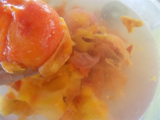 Bước 2: Sau đó vớt đào ngâm vào âu nước lạnh (không cần có đá lạnh). Khi đào hơi nguội thì lột vỏ.