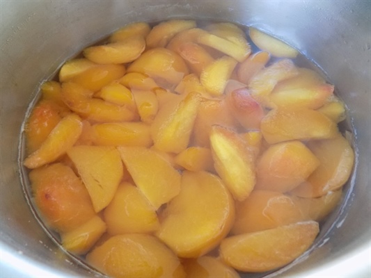 Bước 5: Sau khi nước đường đã sôi cho đào vào, hạ thấp lửa rim khoảng 20-25 phút. Trong khi rim đào, các bạn nhớ hớt bọt để nước đường trong. Bây giờ miếng đào đã ngấm đường và màu rất đẹp.