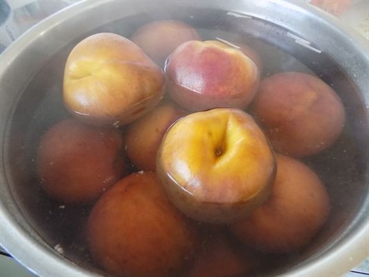 Bước 1: Đào rửa sạch, Nấu 1 nồi nước sôi cho đào vào luộc 2-3 phút ( bước này giúp bạn lột vỏ đào dễ dàng).