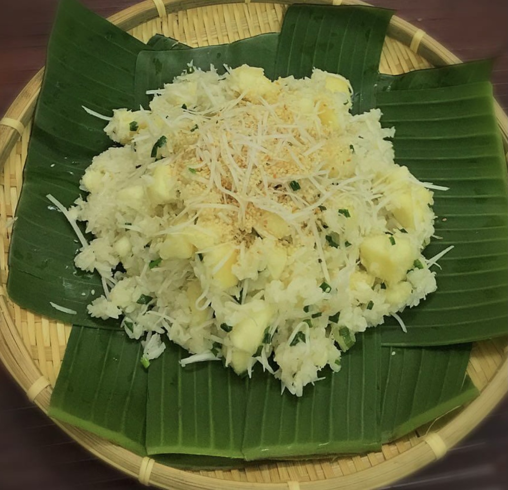 Nếp trắng ngần, sắn trắng tinh, hành lá xanh mướt mát. Hạt xôi mọng dẻo quánh, sắn bở bùi bùi, hành lá thơm thơm, mỡ nước ngầy ngậy. Chỉ thế thôi có thể ăn kèm tóp mỡ hoặc thức ăn tuỳ sở thích.