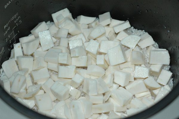 Gạo vớt ra xóc với 2 thìa cà phê bột canh, đổ sắn vào trộn đều, rồi đổ tất cả vào nồi cơm điện, đổ nước trên mặt gạo chút (nhớ ít nước thôi không xôi nhão) rồi nấu như nấu như nấu cơm bình thường,