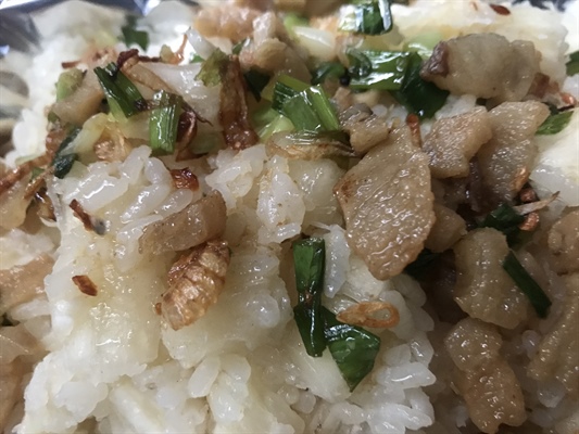 Nếp trắng ngần, sắn trắng tinh, hành lá xanh mướt mát. Hạt xôi mọng dẻo quánh, sắn bở bùi bùi, hành lá thơm thơm, mỡ nước ngầy ngậy.  Chỉ thế thôi có thể ăn kèm tóp mỡ hoặc thức ăn tuỳ sở thích.