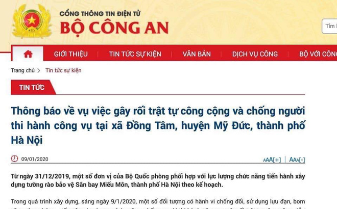 Thông báo về vụ việc gây rối trật tự công cộng và chống người thi hành công vụ tại xã Đồng Tâm, huyện Mỹ Đức, Hà Nội. của Bộ Công an