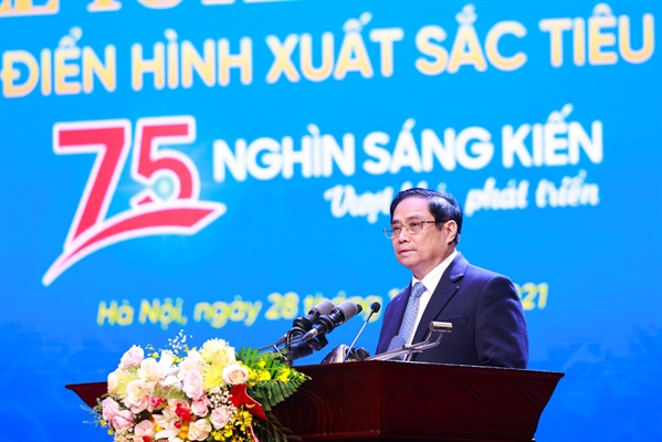 Nhiệm vụ này đòi hỏi các cấp, các ngành, mọi người dân Việt Nam dù trong hay ngoài nước, từ trẻ đến già, từ đồng bằng đến miền núi, cùng chung tay góp công, góp sức, trong đó lực lượng đoàn viên công đoàn, người lao động có vai trò rất quan trọng, là lực lượng tiên phong, nòng cốt, không ngừng phát huy tiềm năng, trí tuệ của mình, nỗ lực lao động sáng tạo, đề xuất được các sáng kiến, đúc rút những kinh nghiệm quý phục vụ sản xuất, công tác. “Chương trình “75 nghìn sáng kiến vượt khó, phát triển” có sức lan tỏa mạnh trong tổ chức Công đoàn và toàn xã hội, góp phần tạo ra động lực và sức mạnh để hoàn thành xuất sắc kế hoạch sản xuất, kinh doanh của từng đơn vị, nhiệm vụ chính trị của từng cơ quan. Chương trình đã tạo được phong trào thi đua lao động hăng say, sáng tạo rộng khắp, qua đó đã xuất hiện nhiều tập thể và cá nhân điển hình, trong đó có những điển hình xuất sắc tiêu biểu được tôn vinh ngày hôm nay. Đây là những những điển hình sáng tạo, thể hiện bản lĩnh, trí tuệ người lao động Việt Nam thời kỳ đổi mới, càng trong những hoàn cảnh khó khăn càng được phát huy mạnh mẽ, càng khó khăn càng đoàn kết, càng khó khăn càng sáng tạo của người Việt Nam”, Thủ tướng ghi nhận.