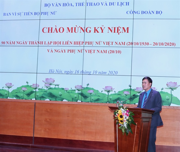 Phó Chủ tịch Công đoàn Bộ VHTTDL Trần Huy Toản báo cáo kết quả hoạt động nữ công Công đoàn năm 2020