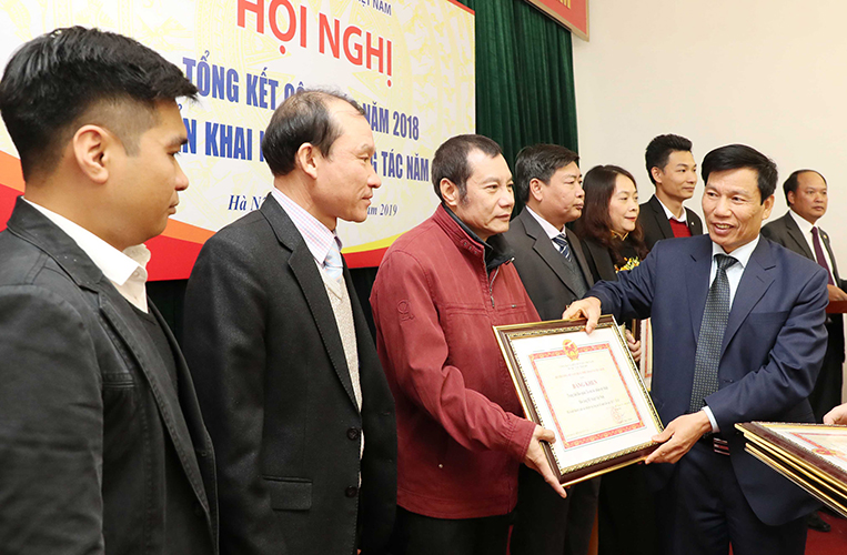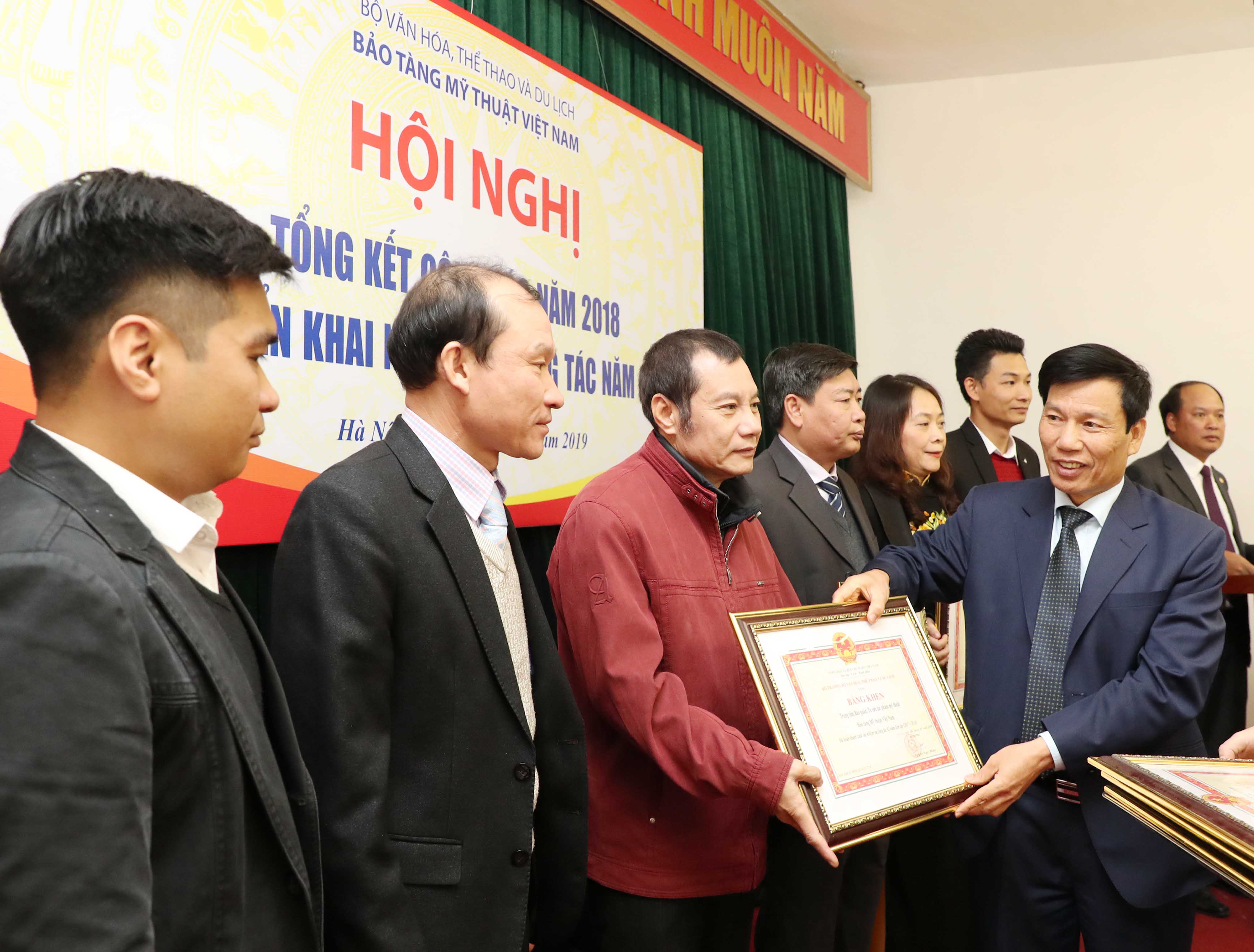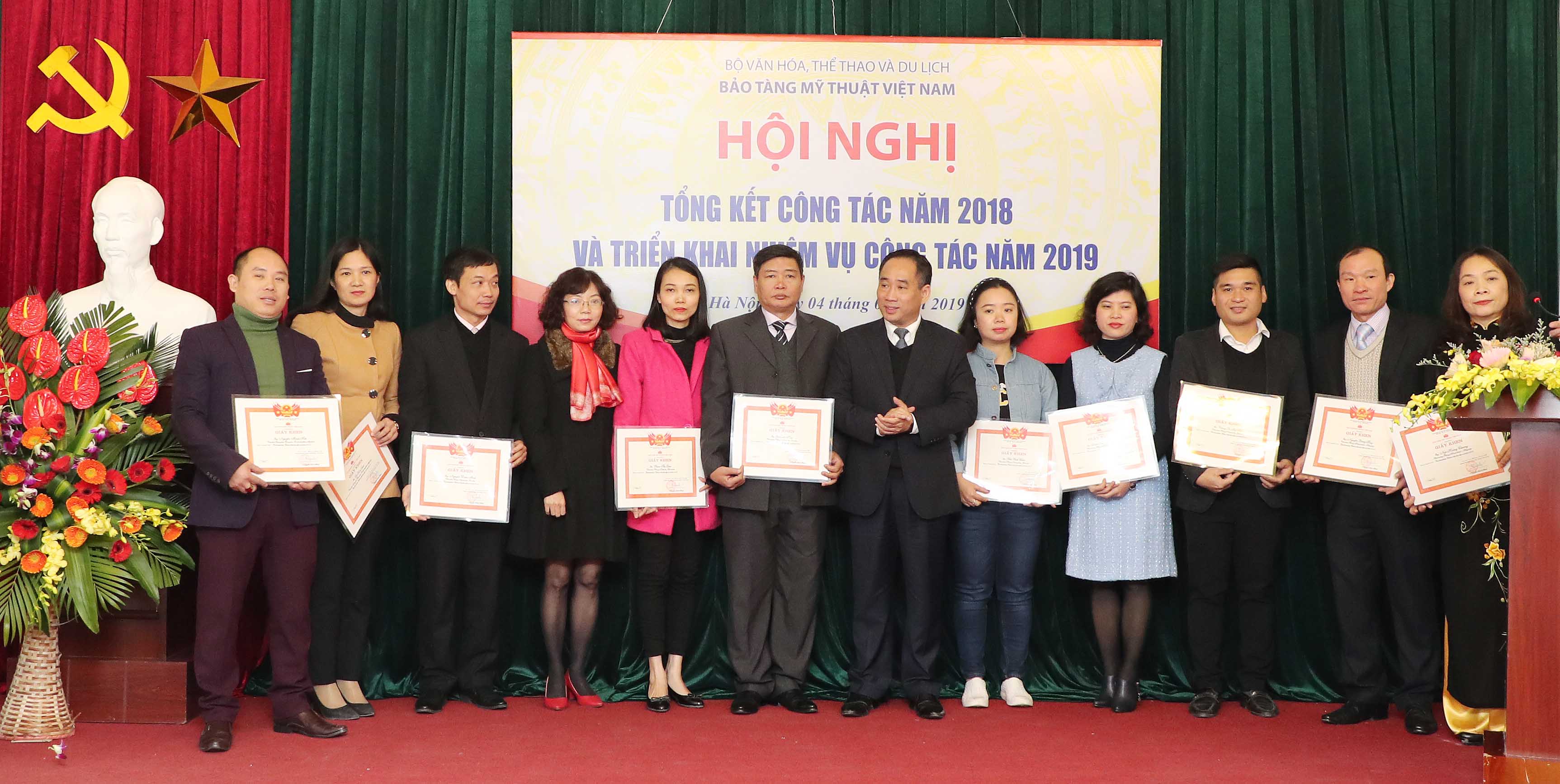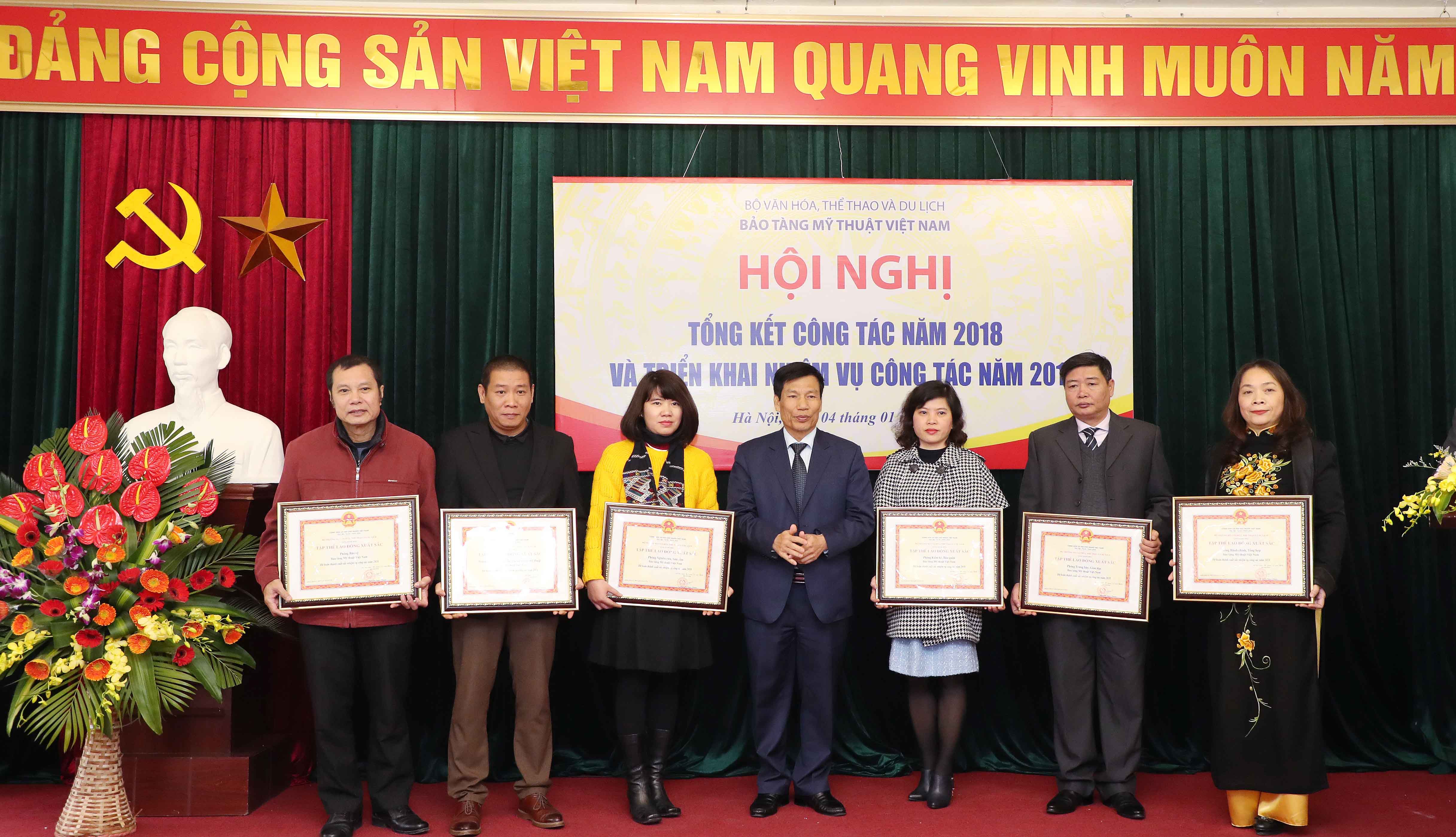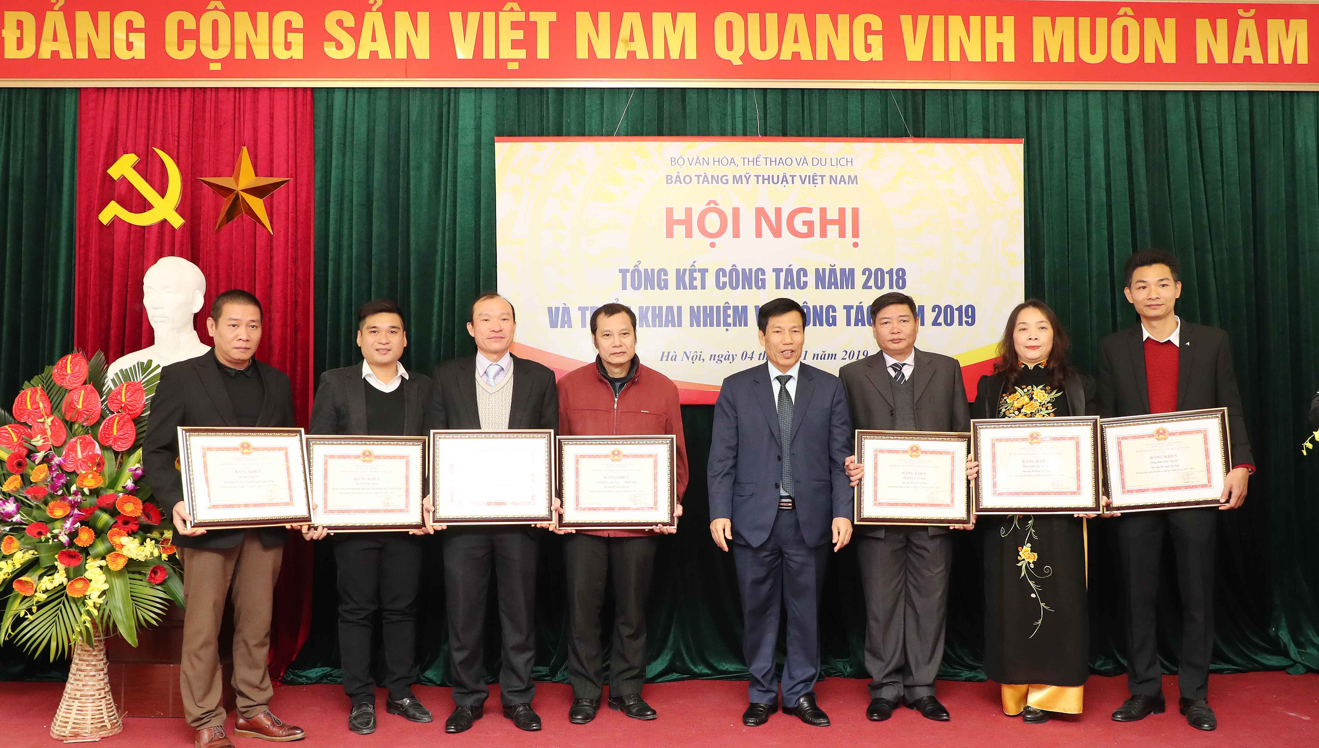 Tại Hội nghị, Bộ trưởng đã trao tặng Bằng khen cho 5 tập thể và 2 cá nhân thuộc Bảo tàng đã hoàn thành xuất sắc nhiệm vụ trong 2 năm liên tục 2017-2018; trao Quyết định công nhận danh hiệu Tập thể lao động xuất sắc cho 6 tập thể thuộc BTMTVN.