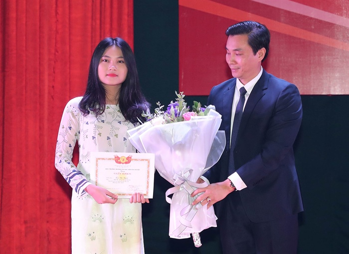 Tân sinh viên, Thủ khoa K59 Bùi Thị Uyên nhận Giấy khen và hoa của nhà trường