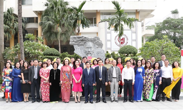 Bộ trưởng Nguyễn Ngọc Thiện chụp ảnh lưu niệm với thầy và trò trường Đại học Văn hóa Hà Nội