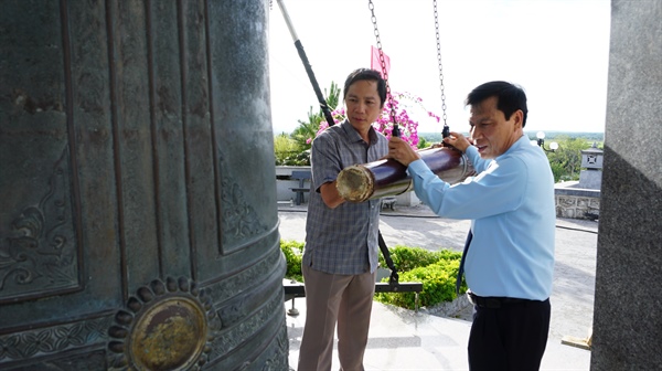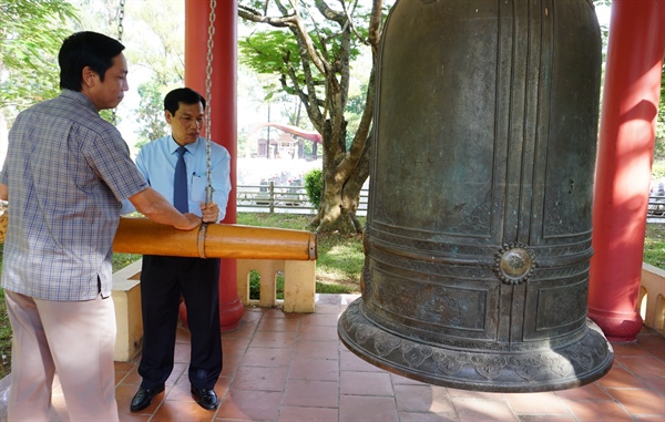 Trước lễ dâng hương tại Nghĩa trang liệt sĩ Thành phố Huế, Bộ trưởng Nguyễn Ngọc Thiện thỉnh hồi chuông ở tháp chuông Hòa Bình