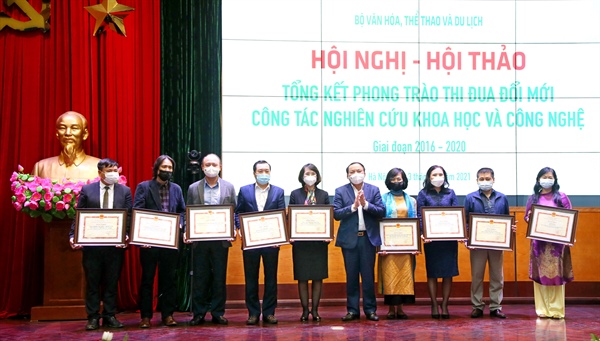 Báo cáo tổng kết phong trào thi đua trong nghiên cứu khoa học và công nghệ giai đoạn 2016-2020, ông Nguyễn Thế Hùng, Vụ trưởng Vụ Khoa học công nghệ và Môi trường (KHCN&MT), Bộ VHTTDL cho biết, thực hiện Quyết định số 3212/QĐ-BVHTTDL ngày 25.9.2015 của Bộ trưởng Bộ VHTTDL về việc phê duyệt nội dung phong trào thi đua “Đổi mới quản lý nâng cao chất lượng, hiệu quả công tác nghiên cứu khoa học và công nghệ của Bộ VHTTDL”, 100% các cơ quan, đơn vị thuộc Bộ đã tuyên truyền, phổ biến, quán triệt nội dung của quyết định đến cán bộ, giảng viên, nghiên cứu viên của đơn vị thông qua các hội nghị, hội thảo chuyên đề, hoặc trang thông tin điện tử. Qua đó, đã có tác dụng khơi dậy niềm say mê nghiên cứu khoa học trong cán bộ, công chức, viên chức, nhà khoa học, nghiên cứu viên thuộc đơn vị.