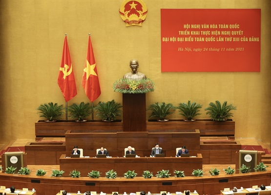 Và hôm nay, tại Phòng họp Diên Hồng - nơi đại diện cho tinh thần Dân chủ, ý chí Độc lập, Tự cường của dân tộc Việt Nam - trong thời điểm toàn Đảng, toàn dân, toàn quân ta đang tích cực triển khai Nghị quyết Đại hội XIII, chủ động phòng chống dịch bệnh Covid-19 theo hướng thích ứng an toàn, linh hoạt, kiểm soát hiệu quả dịch bệnh để khôi phục, phát triển kinh tế - xã hội, Hội nghị văn hóa toàn quốc được Bộ Chính trị, Ban Bí thư quyết định tổ chức, thể hiện sự quan tâm sâu sắc của Đảng, Nhà nước đối với sự nghiệp phát triển văn hóa gắn với xây dựng con người Việt Nam.