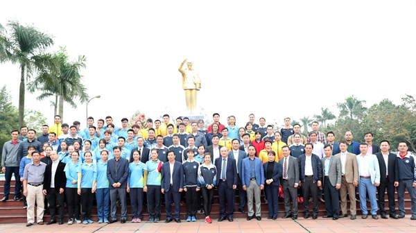 Bộ trưởng Nguyễn Ngọc Thiện chụp ảnh lưu niệm cùng các huấn luyện viên, vận động viên tại Trung tâm Huấn luyện thể thao Quốc gia Hà Nội (2.2019)