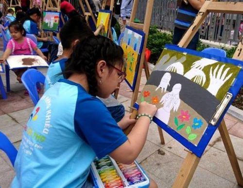 Các em thiếu nhi vẽ tranh với chủ đề bảo vệ trẻ em khỏi xâm hại tình dục. Ảnh: Minh Châu