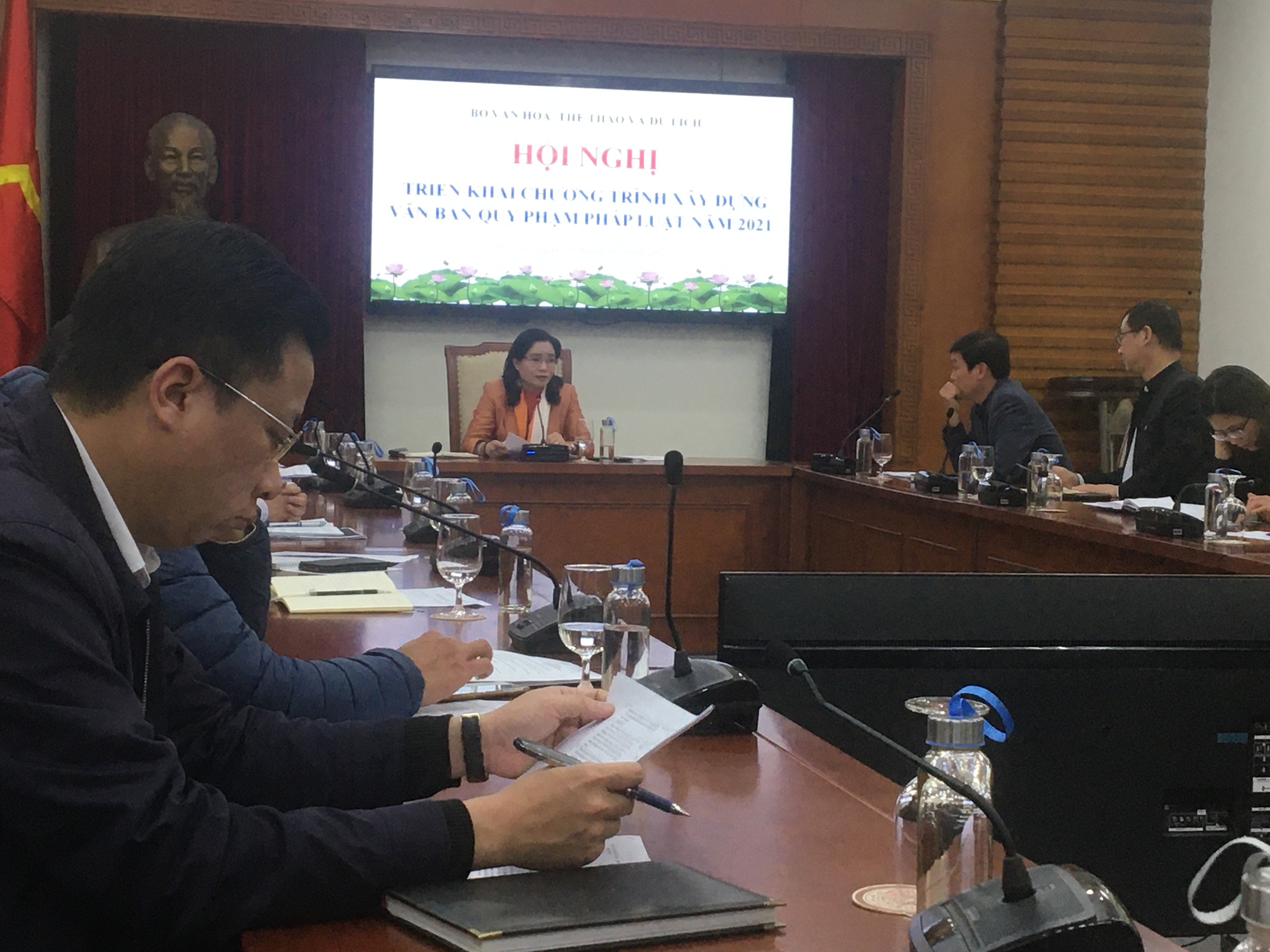 Dự kiến trong năm 2021, Bộ VHTTDL sẽ xây dựng dự thảo sửa đổi của 3 luật: Luật Điện ảnh (sửa đổi), Luật Sở hữu Trí tuệ (phần quyền tác giả, quyền liên quan), Luật Phòng chống bạo lực gia đình (sửa đổi); tham gia xây dựng Dự thảo 5 nghị định, gồm: Nghị định về mô hình Ban Quản lý Khu du lịch quốc gia, Nghị định sửa đổi Nghị định số32/2012/NĐ-CP ngày 12.4.2012 về quản lý xuất khẩu, nhập khẩu văn hoá phẩm không nhằm mục đích kinh doanh (nội dung về điện ảnh); Nghị định sửa đổi, bổ sung Nghị định số 168/2017/NĐ-CP của Chính phủ quy định chi tiết một số điều của Luật Du lịch; Nghị định sửa đổi, bổ sung Nghị định 36/2018/NĐ-CP; Nghị định sửa đổi, bổ sung một số điều của các Nghị định về xử phạt vi phạm hành chính trong lĩnh vực văn hoá, thể thao và du lịch. Trong kế hoạch xây dựng văn bản quy phạm pháp luật của Bộ, có 13 thông tư sẽ được xây dựng, sửa đổi, bổ sung.