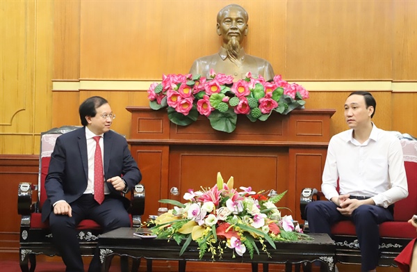 Thứ trưởng Tạ Quang Đông trao đổi với Phó Chủ tịch Ủy ban Trung ương MTTQ Việt Nam Phùng Khánh Tài