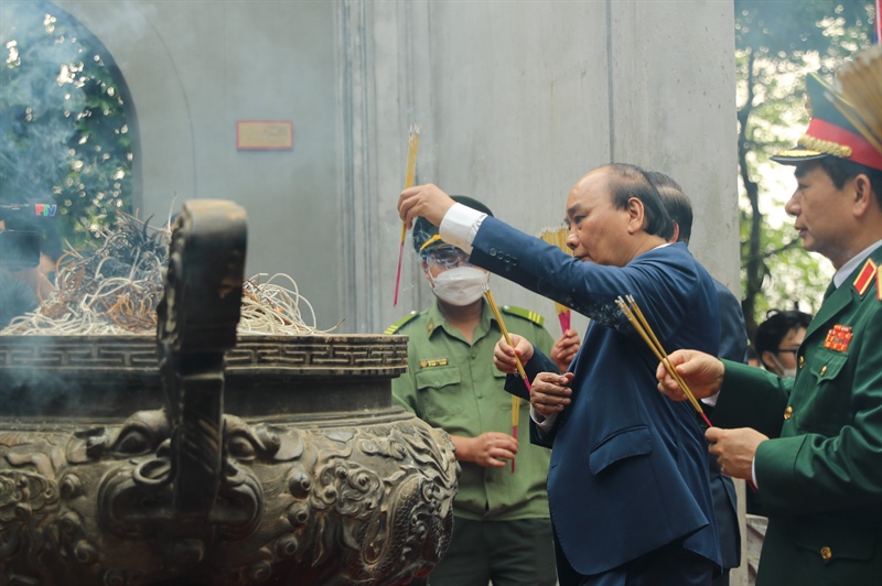 VHO-Sáng nay 10.4 (tức mùng 10.3 âm lịch), tại điện Kính Thiên trên đỉnh Nghĩa Lĩnh thuộc Khu di tích lịch sử quốc gia đặc biệt Đền Hùng (Phú Thọ), Chủ tịch nước Nguyễn Xuân Phúc cùng lãnh đạo Đảng, Nhà nước, các Bộ, ngành và tỉnh Phú Thọ dâng hương giỗ Tổ Hùng Vương 2022 tại Khu di tích lịch sử Đền Hùng. Tham dự đoàn có Bộ trưởng Bộ VHTTDL Nguyễn Văn Hùng.