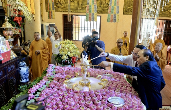 Chủ tịch nước Nguyễn Xuân Phúc và Bí thư Thành ủy TP.HCM Nguyễn Văn Nên thực hiện nghi thưc tắm Phật