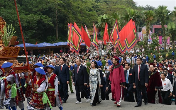 Sau Lễ dâng hương tại Đền Thượng, Chủ tịch nước Nguyễn Xuân Phúc và các đại biểu đã đặt vòng hoa và thắp hương tại Lăng Hùng Vương; dâng hoa tại bức phù điêu “Bác Hồ nói chuyện với Đại đoàn quân tiên phong” tại ngã năm Đền Giếng.
