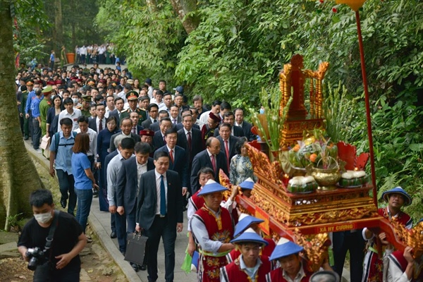 Trong thời khắc thiêng liêng, tại thượng cung Đền Thượng trên đỉnh núi Nghĩa Lĩnh, Chủ tịch nước Nguyễn Xuân Phúc và lãnh đạo Đảng, Nhà nước; lãnh đạo các Ban, Bộ, ngành; lãnh đạo tỉnh Phú Thọ và các đại biểu đã thành kính dâng hương, hoa, lễ vật tri ân và tưởng nhớ công đức các Vua Hùng, các bậc tiền nhân đã có công dựng nước, mở mang bờ cõi, đánh đuổi giặc ngoại xâm, gìn giữ non sông gấm vóc để ngày nay con cháu các Vua Hùng tiếp tục xây dựng nước Việt Nam ngày càng giàu mạnh.