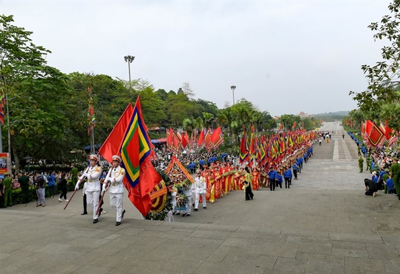 Sau Lễ dâng hương tại Đền Thượng, Chủ tịch nước Nguyễn Xuân Phúc và các đại biểu đã đặt vòng hoa và thắp hương tại Lăng Hùng Vương; dâng hoa tại bức phù điêu “Bác Hồ nói chuyện với Đại đoàn quân tiên phong” tại ngã năm Đền Giếng.