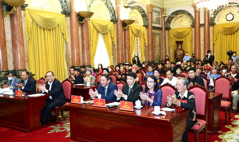 Nhấn mạnh các già làng, trưởng bản, nghệ nhân, người có uy tín trong đồng bào dân tộc là những người tiêu biểu, gương mẫu, cốt cán trong các phong trào của địa phương, “giữ lửa” ở các bản, làng, Chủ tịch nước cho rằng, sự đóng góp quan trọng thể hiện rõ nét qua việc vận động đồng bào các dân tộc giữ gìn, phát huy bản sắc văn hóa dân tộc, những phong tục tập quán tốt đẹp, di sản văn hóa, lễ hội truyền thống, xóa bỏ hủ tục lạc hậu, bài trừ mê tín dị đoan; là cầu nối giữa cấp ủy, chính quyền với người dân, tích cực đóng góp xây dựng hệ thống chính trị cơ sở, giữ gìn an ninh trật tự và tăng cường khối đại đoàn kết dân tộc; trong xóa đói giảm nghèo, xây dựng nông thôn mới…