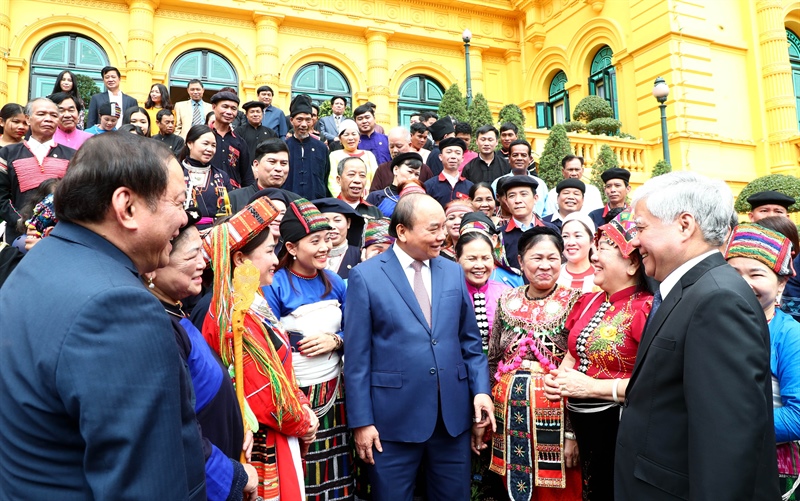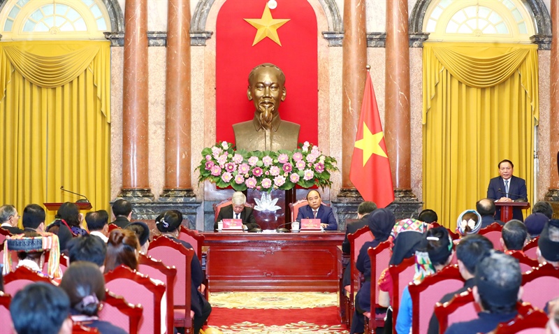 Gửi lời chúc mừng tốt đẹp nhất tới các già làng, trưởng bản, nghệ nhân, người có uy tín đồng bào dân tộc thiểu số, Chủ tịch nước Nguyễn Xuân Phúc khẳng định, công tác chăm lo, cải thiện đời sống vật chất và tinh thần cho đồng bào các dân tộc thiểu số ngày càng được quan tâm và cải thiện rõ rệt, đặc biệt là các dự án, chính sách bảo tồn và phát huy giá trị văn hóa của các dân tộc anh em, coi văn hóa các dân tộc là một phần không thể tách rời của văn hóa Việt Nam.