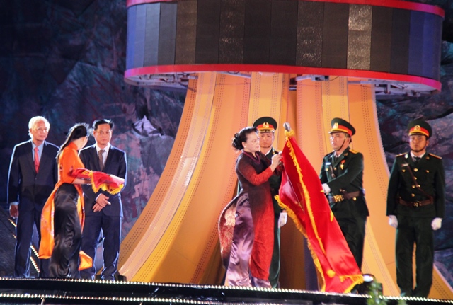 Chủ tịch Quốc hội Nguyễn Thị Kim Ngân gắn Huân chương Độc lập hạng Nhất lên lá cờ tỉnh Phú Yên