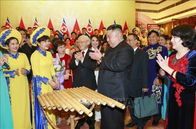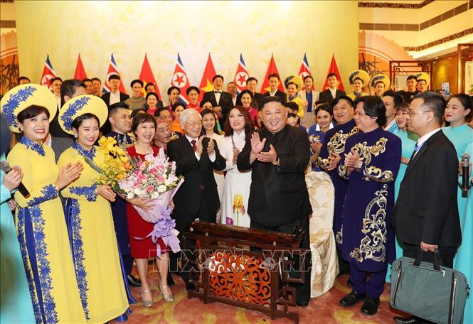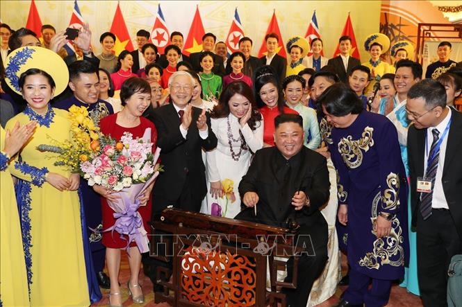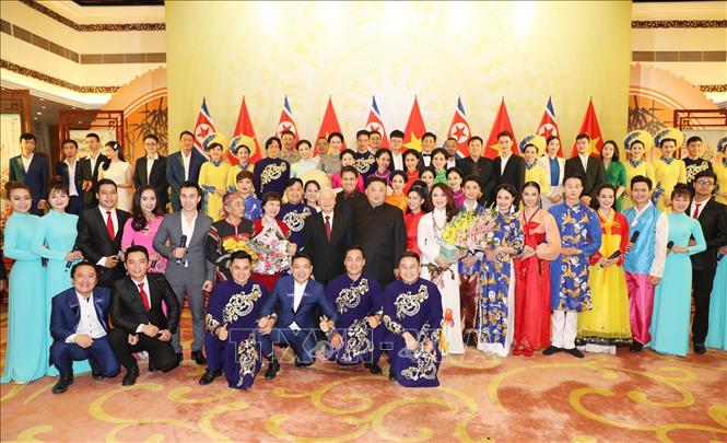 Tổng Bí thư, Chủ tịch nước Nguyễn Phú Trọng và Chủ tịch Triều Tiên Kim Jong-Un với các nghệ sĩ , diễn viên. Ảnh: Trí Dũng/TTXVN