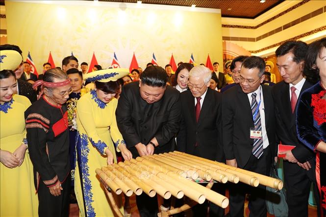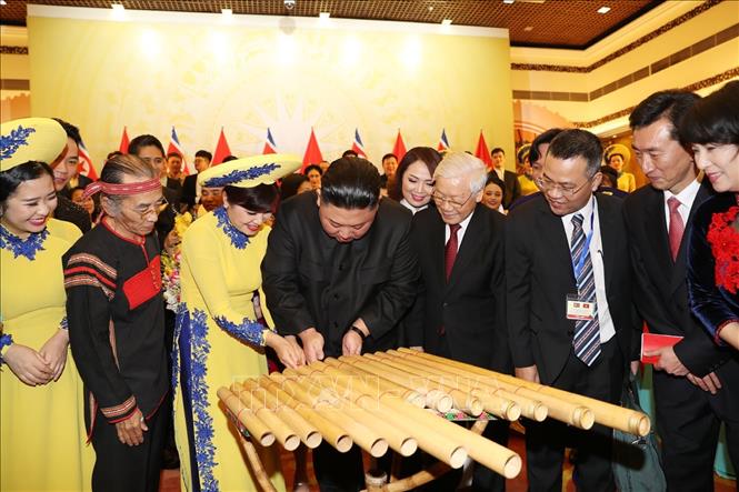 Chủ tịch Triều Tiên Kim Jong Un đánh thử nhạc cụ dân tộc Việt Nam. Ảnh: Doãn Tấn/TTXVN