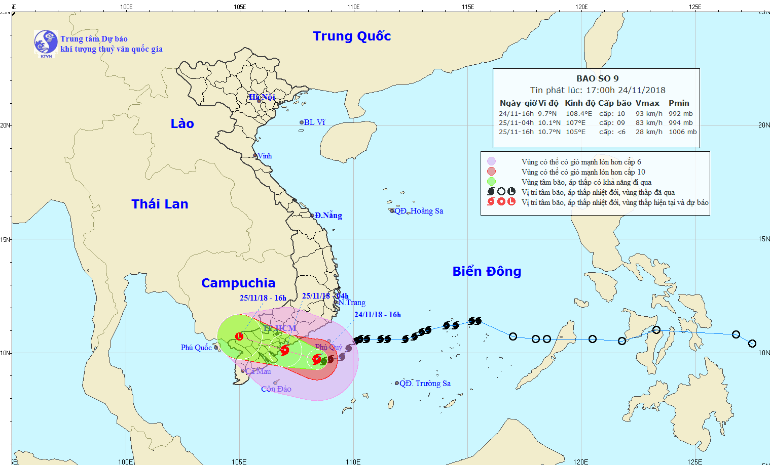 Theo Công điện, chiều ngày 22 tháng 11 năm 2018, áp thấp nhiệt đới trên Biển Đông đã mạnh lên thành cơn bão số 9 và đang di chuyển hướng về khu vực quần đảo Trường Sa và đất liền nước ta. Dự báo, cơn bão số 9 còn tiếp tục mạnh thêm, ngày 24 hoặc sáng ngày 25 tháng 11 năm 2018, vùng tâm bão có khả năng ảnh hưởng trực tiếp và đổ bộ vào khu vực Nam Trung Bộ và Đông Nam Bộ với sức gió mạnh nhất gần tâm bão cấp 9-10, giật cấp 11-12 và gây mưa lớn trên diện rộng, nguy cơ ngập sâu, lũ ống, lũ quét, sạt lở đất tại các tỉnh Trung Bộ và Nam Tây Nguyên, nhất là các khu vực đã bị ảnh hưởng của mưa lớn do cơn bão số 8 vừa qua.
