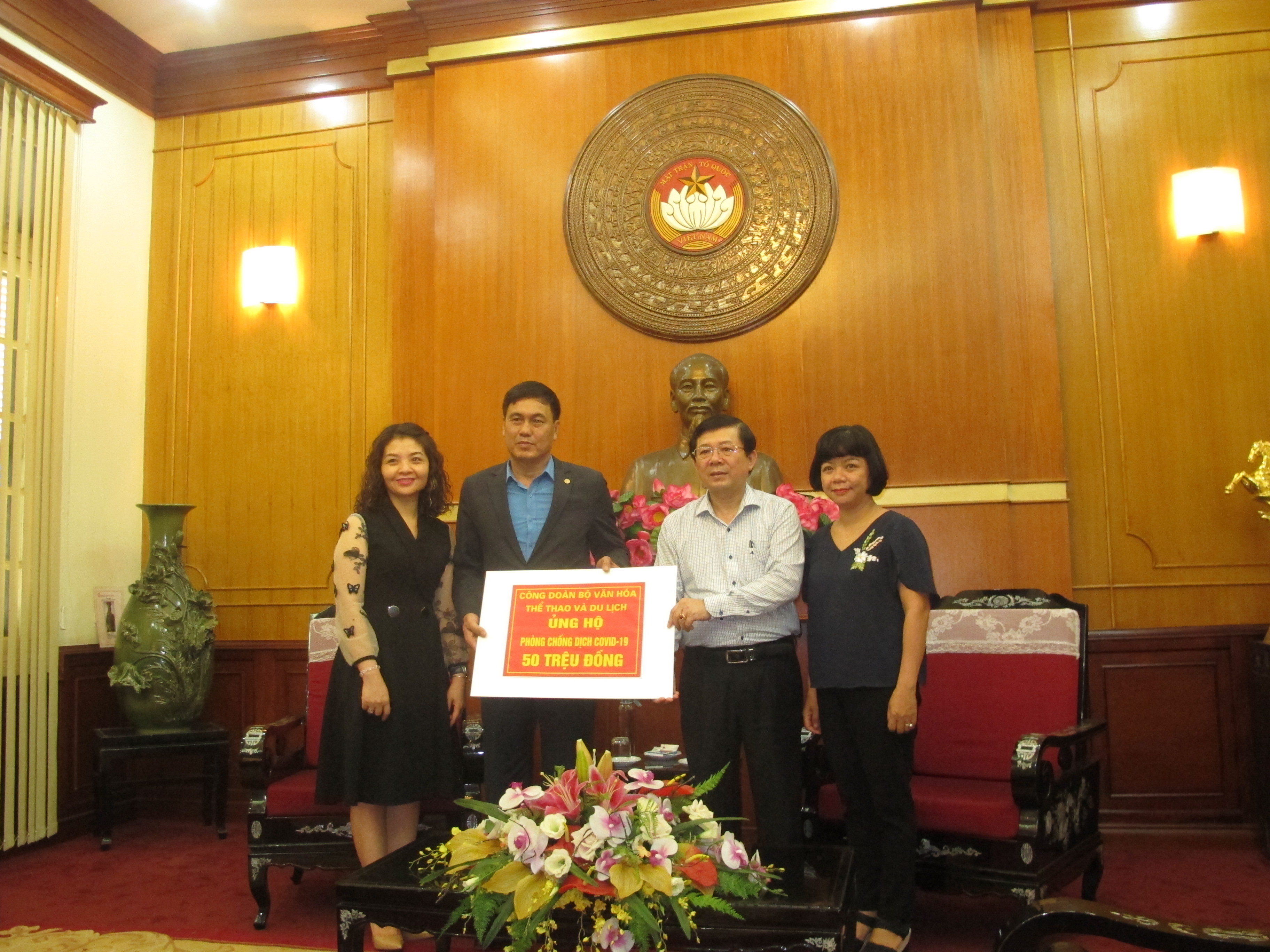 Phó Chủ tịch Công đoàn Bộ VHTTDL Trần Huy Toản cho biết: “Số tiền Công đoàn Bộ ủng hộ vào Quỹ phòng, chống dịch bệnh Covid-19 là 50 triệu đồng, được trích từ nguồn hoạt động của Công đoàn Bộ và đóng góp của một số tổ chức Công đoàn thuộc Bộ. Ngoài việc trao ủng hộ trực tiếp bằng tiền mặt thì cá nhân các cán bộ, công chức, viên chức và người lao động trong các đơn vị thuộc Bộ đã tự ủng hộ bằng hình thức nhắn CV n gửi về 1407 (trong đó, n là số lần ủng hộ 20.000 đồng) theo phát động của Công đoàn Bộ đóng góp ủng hộ công tác phòng, chống dịch thông qua Cổng thông tin điện tử nhân đạo Quốc gia 1400. Đợt phát động kéo dài từ 20.3 đến 18.6”.