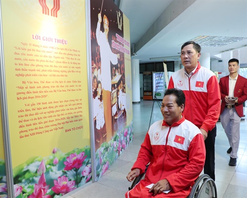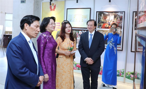 Phó Chủ tịch nước Đặng Thị Ngọc Thịnh, Bộ trưởng Nguyễn Ngọc Thiện và các đại biểu xem Triển lãm Một số hình ảnh phong trào Thi đua yêu nước và các gương điển hình tiên tiến của Bộ VHTTDL