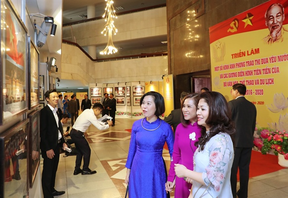 Các đại biểu xem Triển lãm Một số hình ảnh phong trào Thi đua yêu nước và các gương điển hình tiên tiến của Bộ VHTTDL