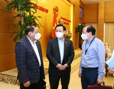 | Chủ tịch Quốc hội Vương Đình Huệ trao đổi với Bộ trưởng Nguyễn Văn Hùng và Thứ trưởng Tạ Quang Đông