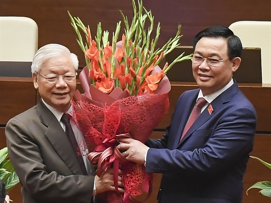 Chủ tịch Quốc hội Vương Đình Huệ tặng hoa chúc mừng đồng chí Nguyễn Phú Trọng đã hoàn thành xuất sắc nhiệm vụ mà Đảng, Nhà nước và nhân dân giao phó với trọng trách là Chủ tịch nước Cộng hòa xã hội chủ nghĩa Việt Nam