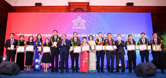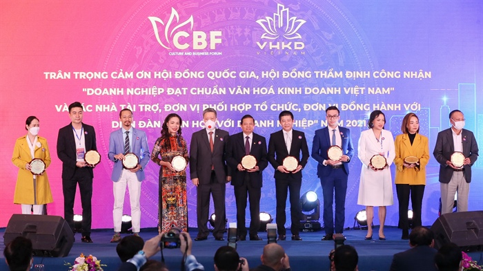 Bộ trưởng Nguyễn Văn Hùng, Chủ tịch Hiệp hội Văn hóa doanh nghiệp Việt Nam Hồ Anh Tuấn trao chứng nhận các doanh nghiệp đạt chuẩn văn hoá kinh doanh Việt Nam