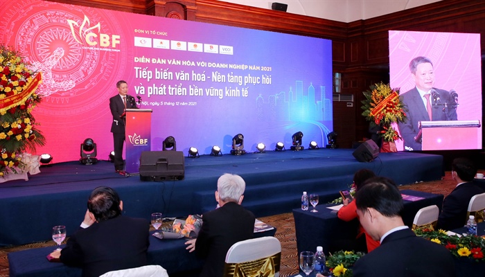 VHO- Chiều 5.12 tại Hà Nội, Diễn đàn quốc gia Văn hoá với doanh nghiệp năm 2021 (Culture & Business Forum - CBF) với chủ đề Tiếp biến văn hoá – Nền tảng phục hồi và phát triển bền vững kinh tế đã được BTC triển khai Cuộc vận động “Xây dựng Văn hóa doanh nghiệp Việt Nam” phối hợp với các Bộ, ban, ngành Trung ương tổ chức. Bộ trưởng Bộ VHTTDL Nguyễn Văn Hùng dự và phát biểu tại Diễn đàn.